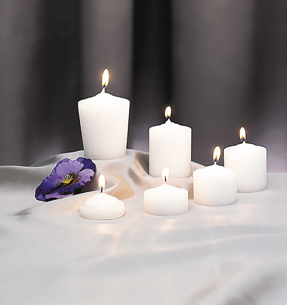 Pressure molded, filtered white wax with specially treated wick to assure clean burning. 144 pieces per carton, straight side.
