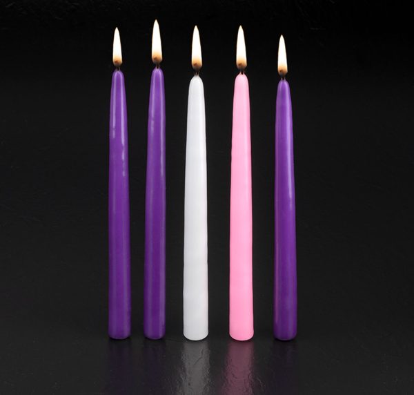 This refill set includes five beautifully crafted candles, each designed to fit snugly into a standard 10-inch Advent wreath. 3 Purple, 1 Rose, and White 10″ Candle. The candles come in traditional Advent colors, symbolizing the anticipation and celebration of the holiday season.