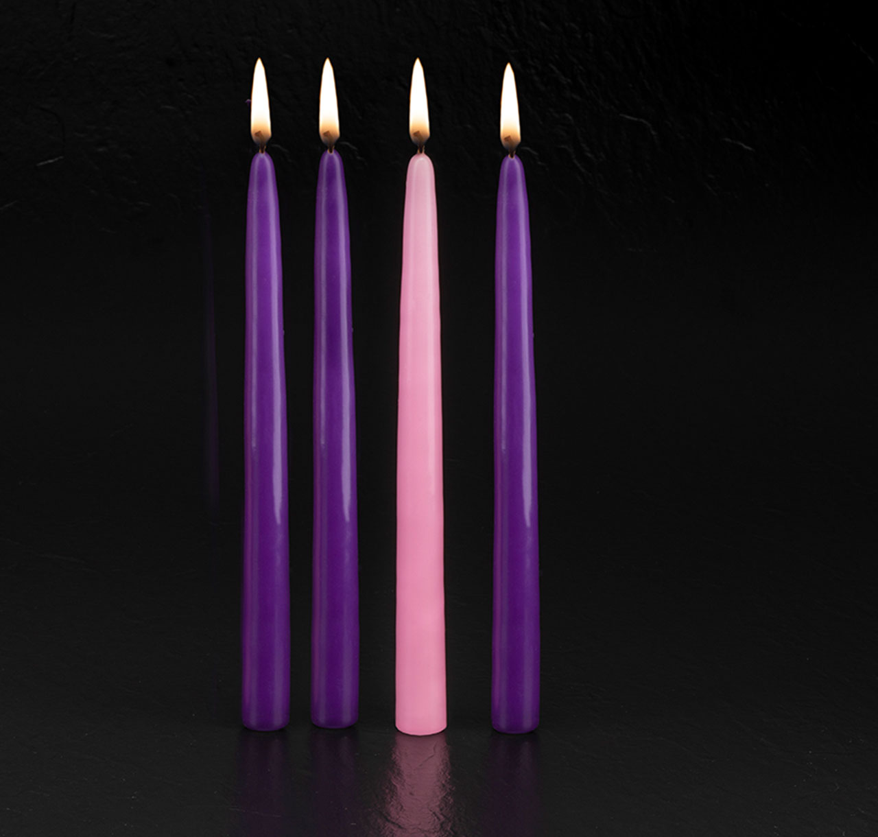 The candles in this set are traditionally colored, representing the four weeks of Advent. Hope, love, joy, and peace. This refill set includes four exquisite candles, each carefully crafted to perfectly fit a standard 15-inch Advent wreath. Carton of 4 tapers. Carton of 4 tapers.